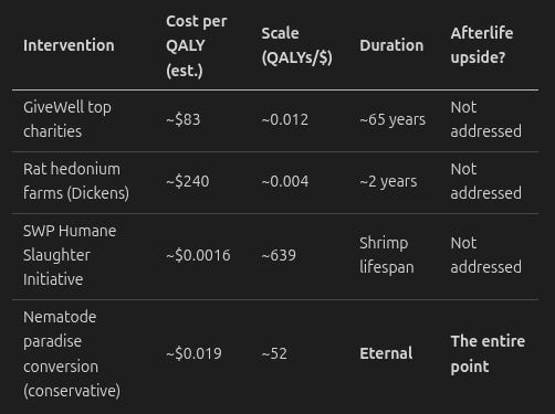 But if any major theological tradition is even approximately correct about the afterlife, then the post-mortem welfare of each nematode is on the order of ±∞ QALYs – or, if you prefer to avoid infinities, at minimum thousands of QALYs for thousands of years of paradise or damnation. The finite lifetime welfare is a rounding error. The sign of the afterlife term dominates everything.