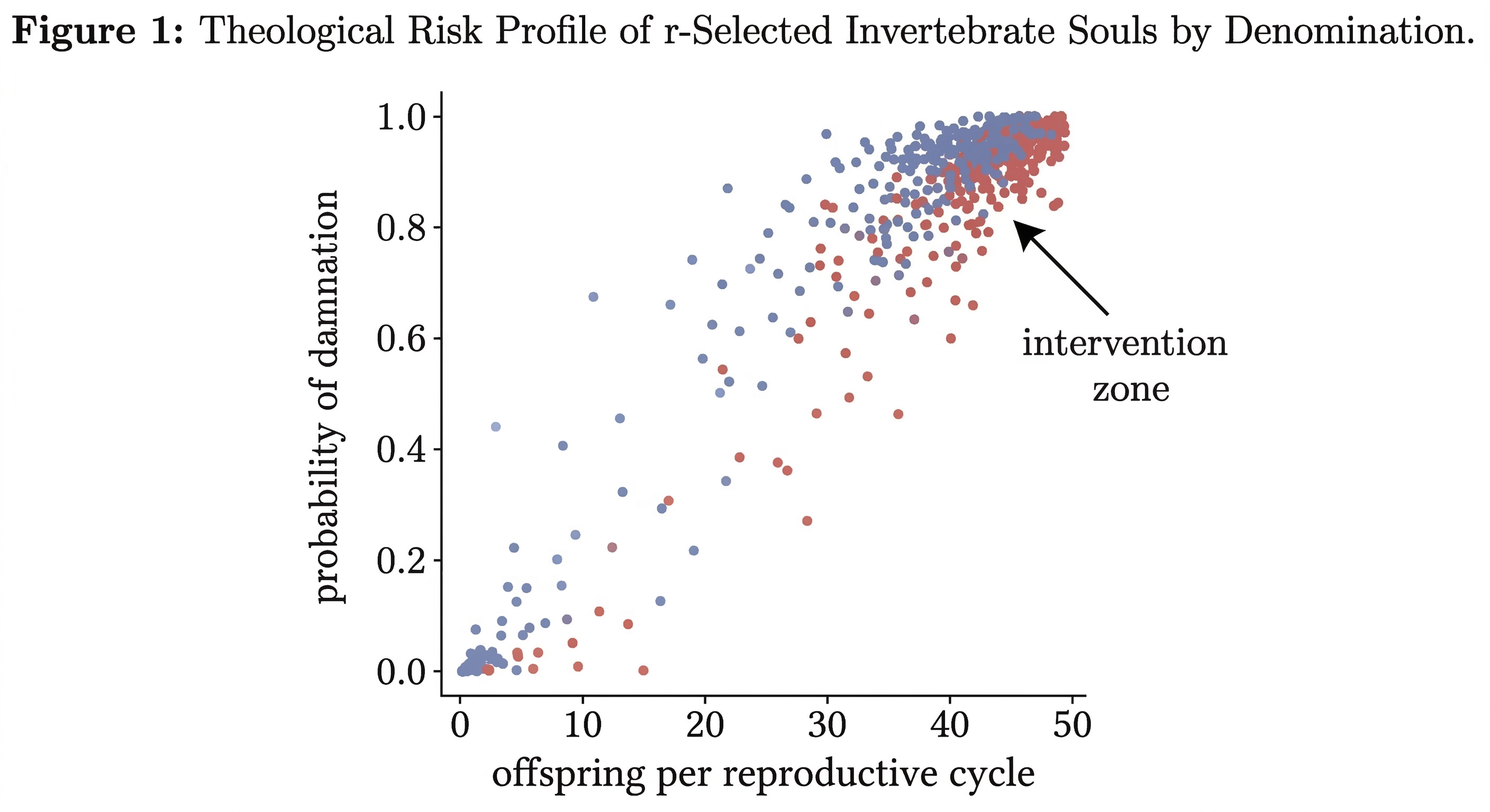 But the afterlife offers ±∞. The finite lifetime welfare term is a rounding error in the eternal expected value calculation. Under theological worldview diversification, with credences spread across Islam, Christianity, and half a dozen other traditions, the expected afterlife outcome for r-strategist invertebrates is dominated by the theological traditions that pose the highest risk to newborn souls – and by the interventions that most cost-effectively mitigate that risk.