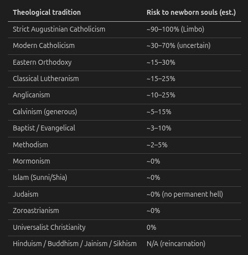 As we will show, the expected value calculation is dominated by the theological traditions that pose the highest risk to newborn souls – and by the interventions that most cost-effectively mitigate that risk.