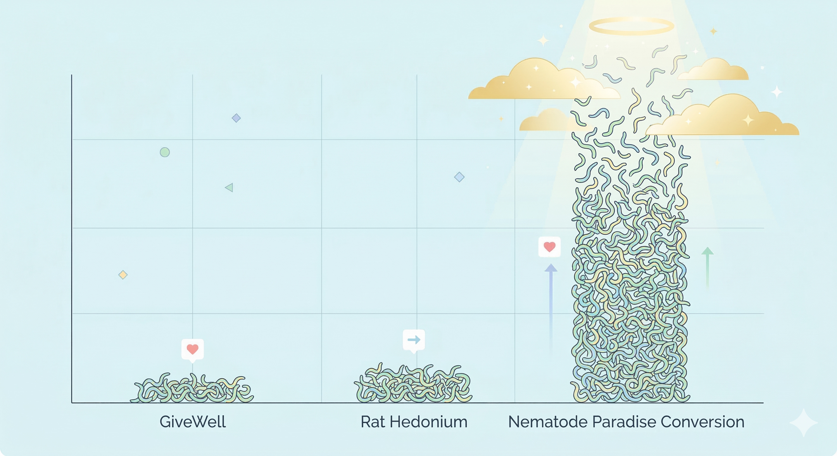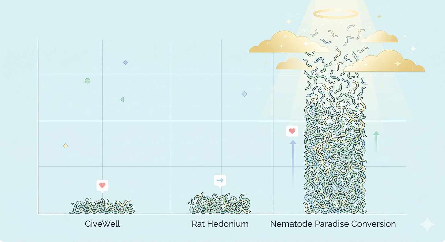 But it doesn’t scale. The rat hedonium farm requires physical space, ongoing feeding, veterinary care, and drug administration. It produces welfare for one rat at a time, for ~2 years per rat. Nematode paradise conversion, by contrast, requires one solar-powered speaker and covers billions of souls per dollar, each for eternity.