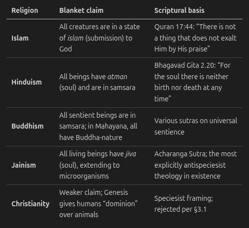 “Nematodes don’t have souls.” Rejected per our antispeciesist assumption (§3.1). Additionally, Islam explicitly claims all creatures praise God (Quran 17:44), Jainism attributes jiva to all living beings including microorganisms, and Hinduism places all beings in samsara. The religions that deny animal souls are outnumbered, by adherents, by those that affirm them.