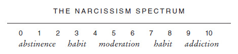 The range 0–3 he calls narcissism deficit or echoism; the range 4–6 is healthy narcissism; and the range 7–10 is extreme narcissism. The scale leaves the most extreme points to professional diagnoses.