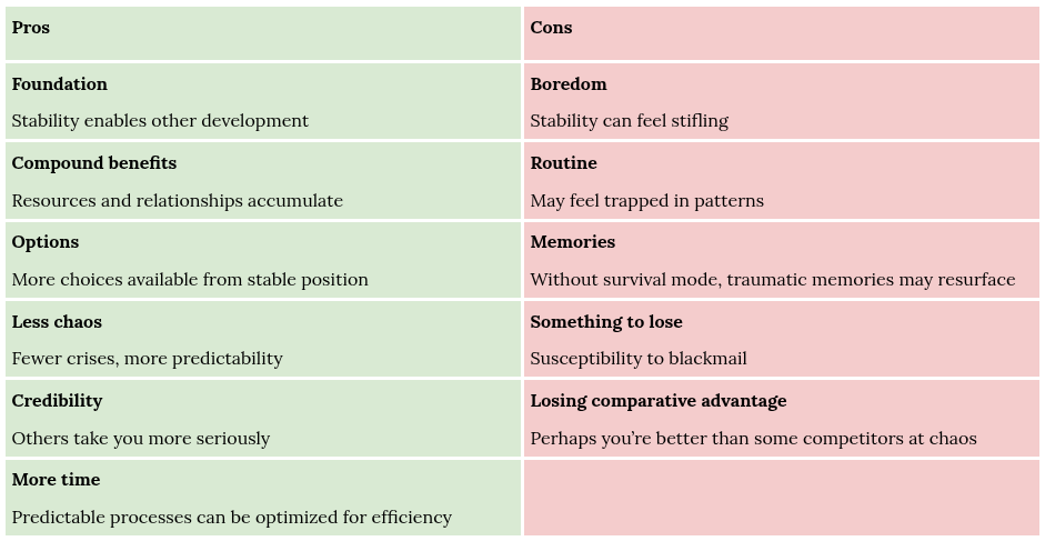 Stability is almost pure upside for most people. Without stability, it’s often necessary to move from hotel to hotel and from country to country, which makes it hard to plan more than a few weeks ahead. That interferes with collaborative efforts such as most paid work. It also increases the cognitive load trying to learn how the local infrastructure works, time and effort that could be spent on efforts with exponential yields (healing, investment, education, networking, getting criminal records sealed).