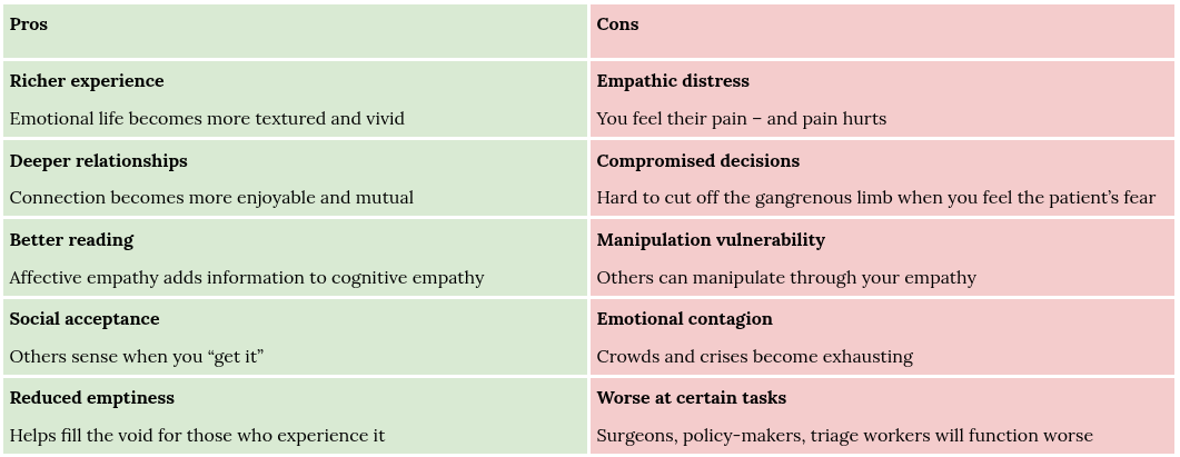 Affective empathy is quite a mixed bag. Sometimes I love it; sometimes I resent it. I love it when I spend time with my partners. I resent it when it encourages me to look away from the overwhelming suffering in the world. Plus many of my friends act morally without empathy. They have values, insight, and regulation. They channel their sadism (if any) into consensual outlets. They don’t need empathy to be a good person – and developing it would have costs they don’t need.