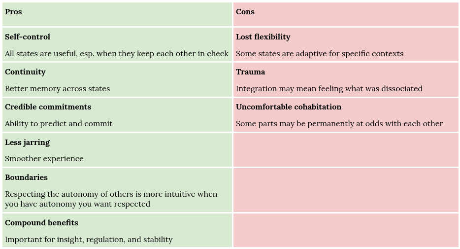 Which brings us to the greatest con of integration: You’re probably already well adapted to low-trust environments, so if you have to continue to function in one – your family, social circles, etc. – integration is no use. It would only give you access to memories and perhaps feelings you don’t want to access, and allow the parts of you to enter into the tug of war that you get when you have parts that often want contradictory things – thrill-seeking vs. surviving to provide for your kids; sadism vs. being good to your friends. Those fights can eventually be settled from what DBT calls the wisemind stance, but it takes practice to get there.