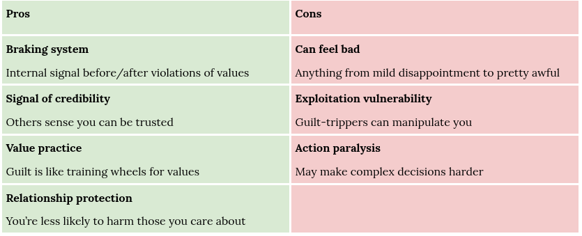 Guilt is a signal, not a virtue. If you already don’t want to harm people you care about, and you have other mechanisms (values, regulation, foresight) to prevent harm, guilt adds suffering without adding benefit. But if you keep accidentally violating your values, guilt will help you notice it earlier and stop sooner.