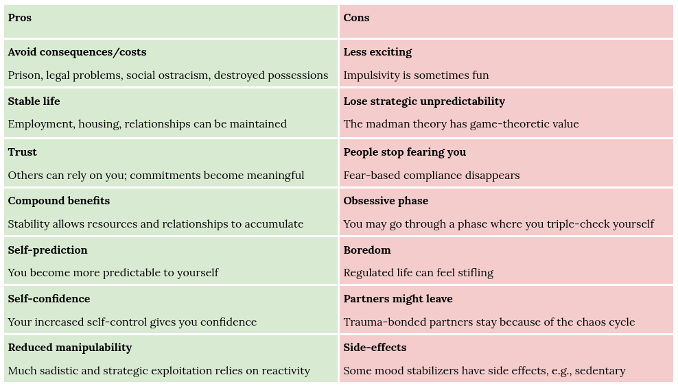 Impulsive decisions often lead to particularly badly executed crimes, manipulability, losing friends and partners, and costs from having to replace damaged possessions. That includes costs from impulsive physical and verbal aggression as well as unpredictable ghosting, moves to other countries, and continual deleting and recreating of social media accounts.