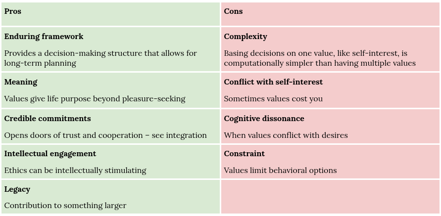 Conversely, though, different values often trade off against each other, which introduces complexity in proportion to the number of values involved. Self-interest is just one of them, so the trade-offs will sometimes conflict with it. Finally, all the game-theoretic advantages of credible commitments constrain behavior ipso facto.