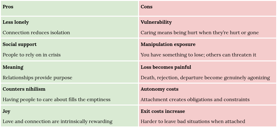 Another cost of attachments is the reduction in flexibility that comes with them as well as the time costs that need to be invested into the coordination. This is a common problem in startups who hire too many employees too quickly and get slowed down even on net by the coordination overhead. Hence there is a sweet spot where the overall joy, safety, and support that come with attachments is balanced against the coordination overhead. If your sweet spot is unusually high, you might consider polyamory. Long-distance relationships are another option to keep the costs from reduced flexibility low.