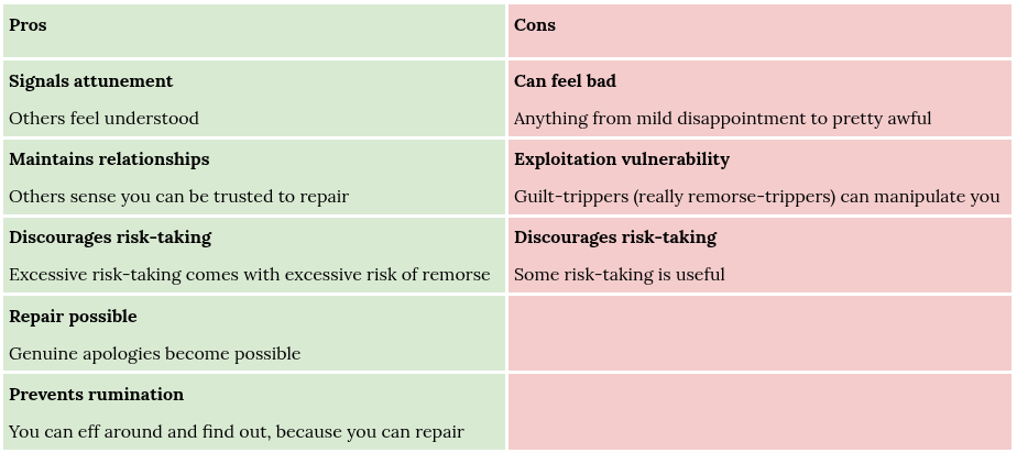 Hence remorse needs to be proportionate. It can allow you to be spontaneous and risk-taking because you know you’ll make it up to whoever you might hurt and you won’t lose friends if you make a mistake. It can also curb excessive risk-taking if the possible consequences are things that would be costly or impossible to repair. But it can also have the opposite effect of stifling healthy risk-taking if the prospective remorse is disproportionate.