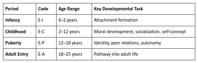 E-C (childhood). Moral development, socialization, self-concept. Key adversity types: Unattuned, neglect, punitive, violent, controlling, parentified, golden, scapegoat. The type of adversity predicts the type of adaptation.