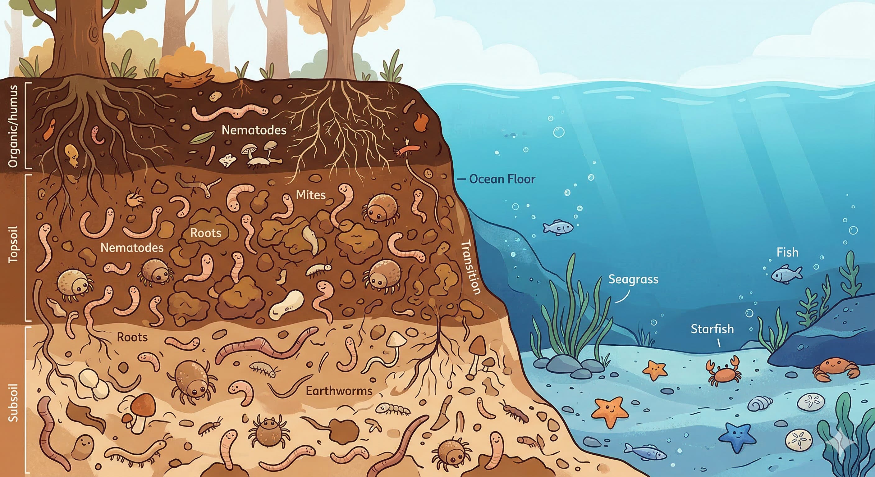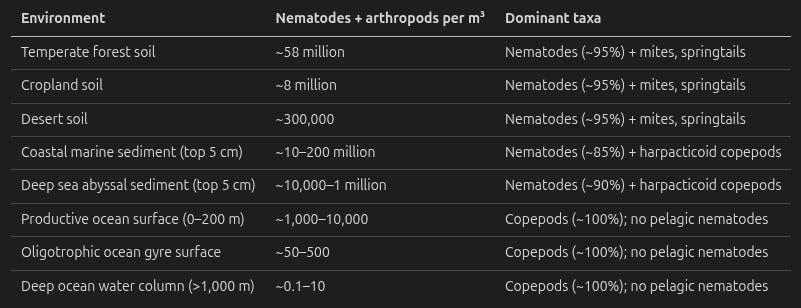 One wrinkle: The dominant taxa change with the habitat. In soil, nematodes and arthropods (mites, springtails) coexist. In marine sediments, nematodes dominate overwhelmingly – they make up 80–90% of meiofauna (benthic organisms of 32–63 μm to 0.5–1 mm), with only small numbers of harpacticoid copepods alongside them. In the open water column, the situation reverses: There are essentially no pelagic nematodes (they are benthic animals, bound to sediment), and the invertebrate fauna is almost entirely arthropods – copepods, krill, and amphipods.