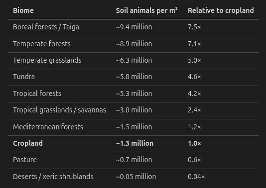 2. Agricultural land has fewer soil animals. Crops have ~1.3 million soil animals per m², compared to ~3–9 million for natural biomes. Pasture has even fewer (~0.7 million). So anything that increases agricultural land – including saving human lives, which increases food demand and therefore cropland – reduces, at first approximation, soil animal populations.